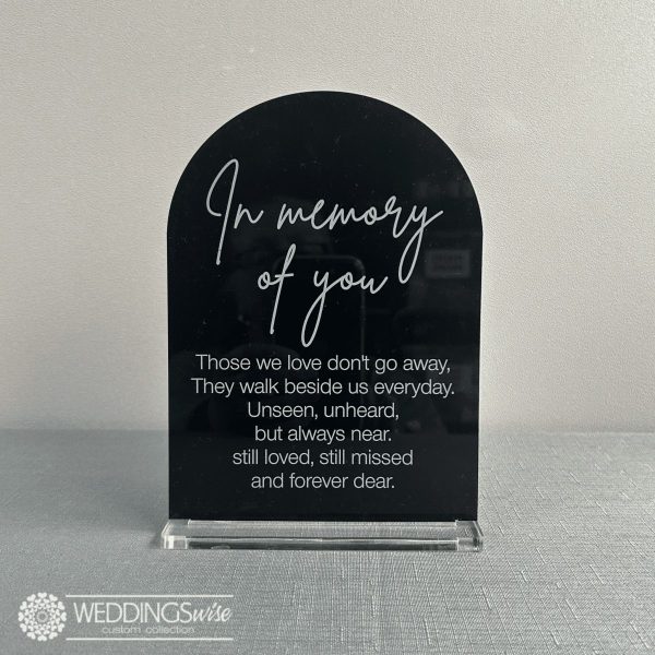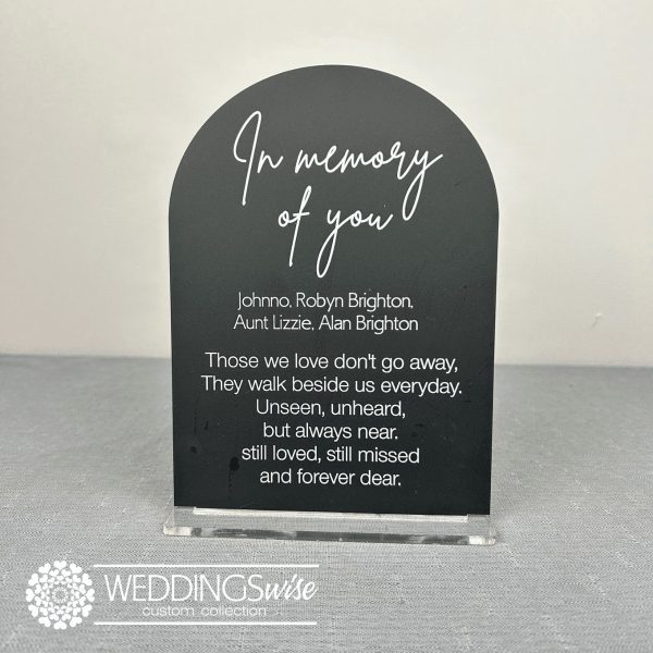 Welcome to Weddingswise, where we understand that not all loved ones may be present for your wedding day. Our “In Memory” signs offer a quiet yet tasteful way to honour and remember those who are no longer with us. Whether you choose an acrylic printed arch sign discreetly placed on a chair at the ceremony, a timber laser-engraved sign adorning a church pew, or a sleek acrylic 3D “Reserve” sign placed on the back of a chair, we have options to meet all your needs. Let Weddingswise help ensure that your loved ones are remembered and remain a special part of your wedding day.