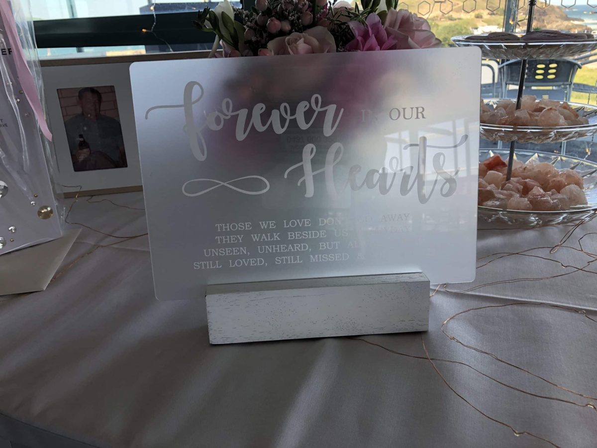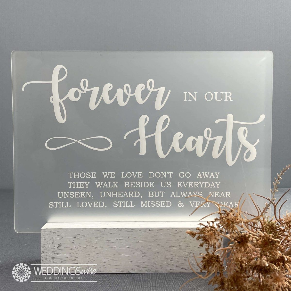 Create a special space and remember loved ones that have passed but are here with you on your day with this Forever In Our Hearts Acrylic Table Sign. Customise your signage with clear or frosted acrylic and either with black or white writing to match your wedding theme.