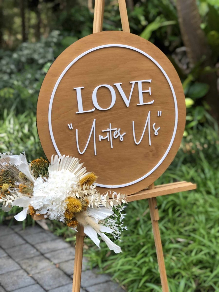 Love Unites Us Timber and 3D Acrylic Sign, perfect for a gorgeous wedding day and a lovely way to welcome your guests as they arrive. Delight and impress your wedding guests by taking a little time to create your own unique wedding welcome sign, customised with your colours and materials. This beautiful customised sign can be placed at the entrance table of your wedding ceremony, easel or reception area. It can also be used as an accent piece in your home as a keepsake of your special day.