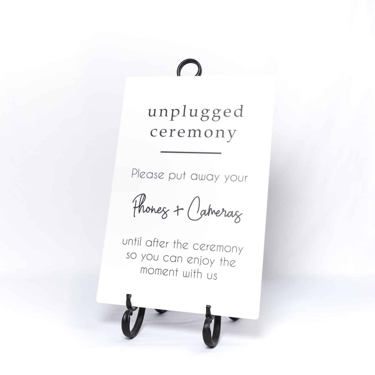 Becoming ever so popular is the wedding “Unplugged” sign. This is placed at the entrance to the ceremony. Hire this sign to kindly let guests know that the bride and groom want their guests to enjoy the moment, and to be fully present throughout the ceremony.