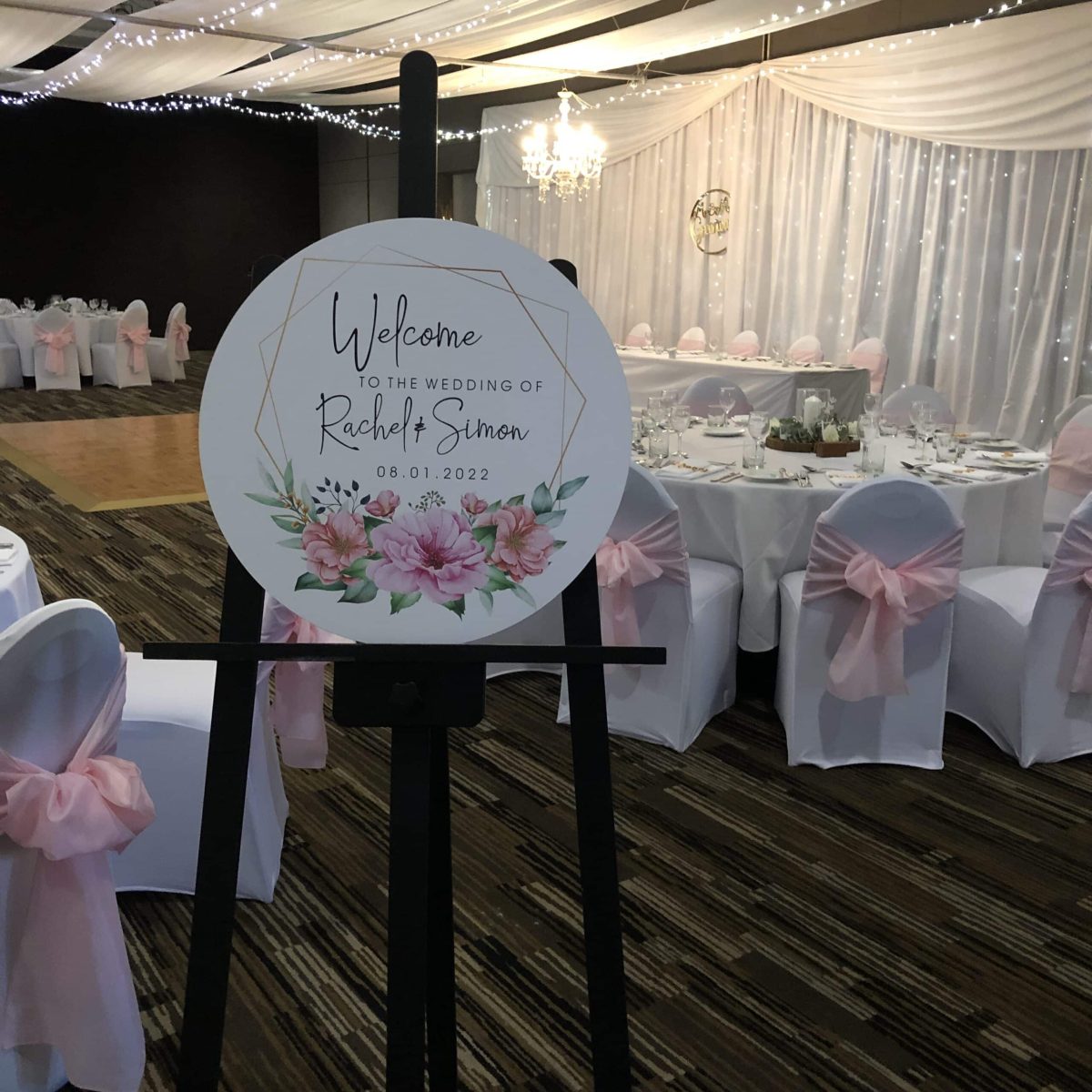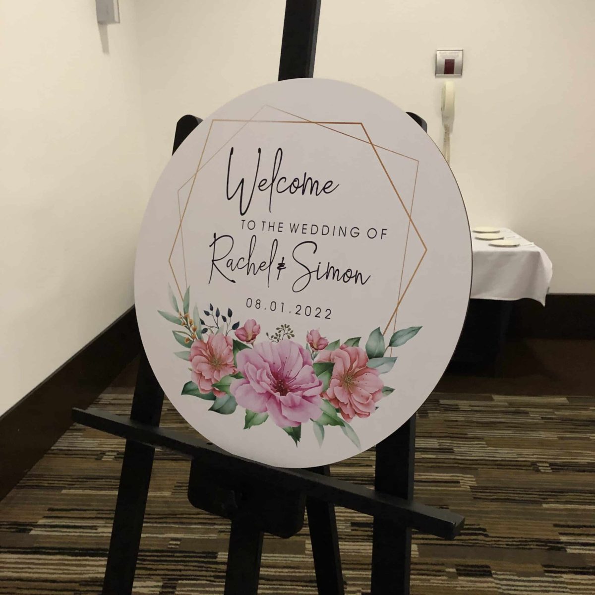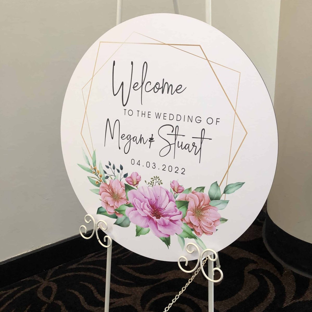 White Spring Flower Wreath Printed Welcome Sign, perfect for a gorgeous wedding day and a lovely way to welcome your guests as they arrive. Delight and impress your wedding guests by taking a little time to create your own unique wedding welcome sign, personalized with your names and wedding date. This 50cm diameter sign custom cut board is laminated with a digital print. This beautiful customised sign can be placed at the entrance table of your wedding ceremony, easel or reception area. It can also be used as an accent piece in your home as a keepsake of your special day.